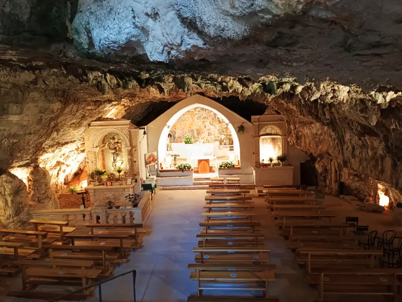La chiesa, appunto, è ricavata in una grotta naturale di origine carsica, la cui volta è costituita da un banco roccioso ricco di concrezioni stalattitiche. Sul prospetto principale si apre l’ingresso, sormontato da un arco ogivale e un campanile. La decorazione delle edicole interne è attribuita allo scultore Stefano da Putignano (XVI secolo), mentre sulla parete frontale a contatto diretto con la roccia era già presente una pregevole decorazione ad affresco del XIV secolo con la rappresentazione della Crocifissione di Cristo, il Christus Patiens che è posto sulla croce esangue e alla cui destra ci sono le pie donne e la Maddalena, che sostengono la Vergine Maria svenuta.